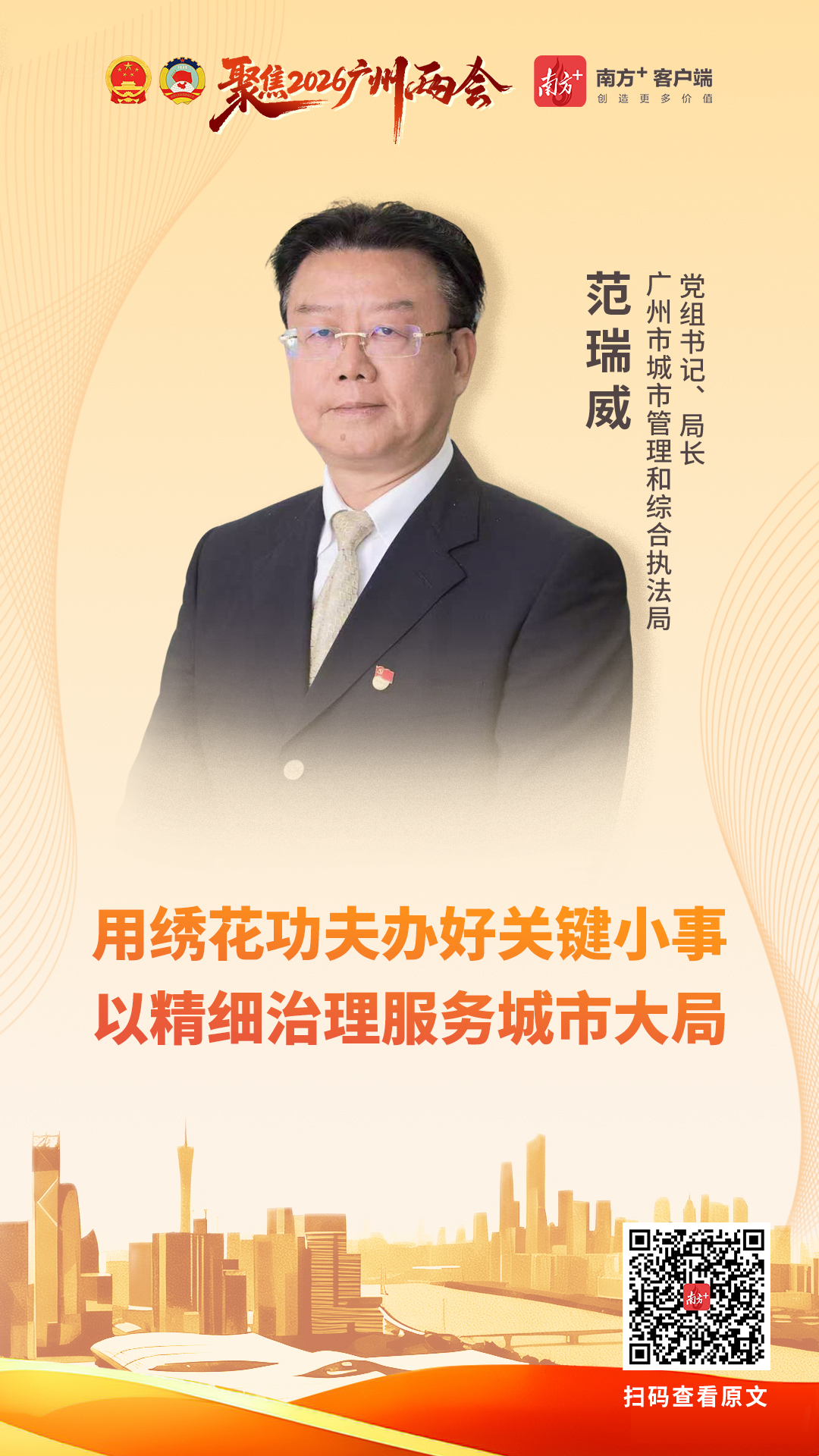 范瑞威表示,“十五五”期间,广州城管坚持人民城市人民建、人民城市为人民,继续以“绣花”功夫推动城市精细化治理,不断创新城市治理的理念、模式、方法。推动城市管理工作深度融入全市发展大局,为广州建设“创新、宜居、美丽、韧性、文明、智慧”的现代化人民城市提供坚实支撑。